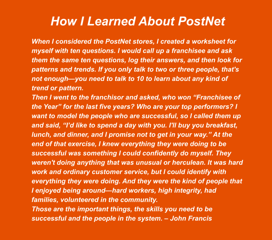 Some franchise systems will allow candidates to attend their brand conference and they'll say, “You know, you didn't buy the franchise, but we want to show you who we are. So come spend a day at our conference.” And it can be really powerful for most people because they get to experience the training; they get to meet the vendors; they get to see the people and the awards. They get a vivid sense of what it would be like to be a franchisee in that system.